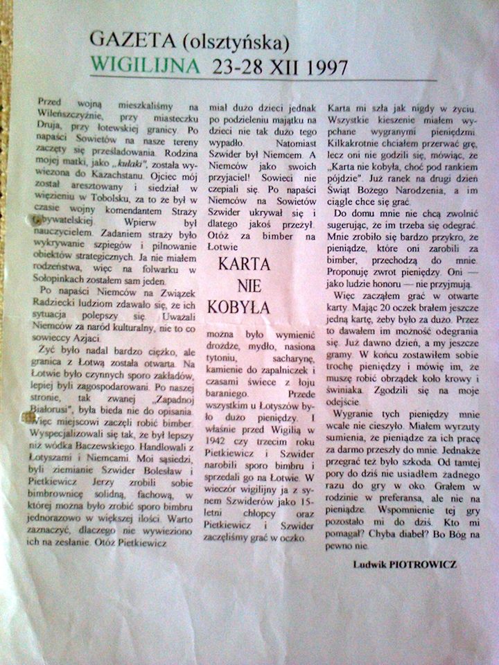 1997r. | Gazeta Olsztyńska | Gazeta (olsztyńska) Wigilijna. Karta nie kobyła - artykuł Ludwika PIOTROWICZA | 23-28.12.1997 |