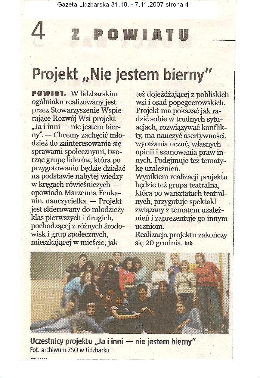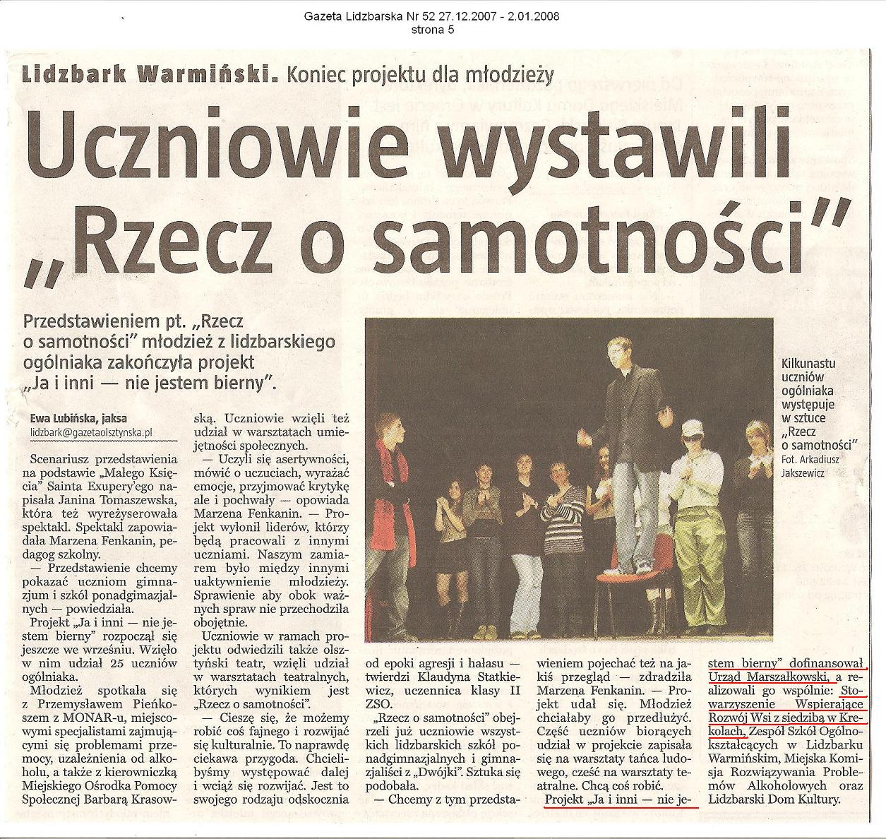 20/60 | Gazeta Lidzbarska | Koniec projektu dla młodzieży. Uczniowie wystawili "Rzecz o samotności" | 27.12.2007 - 2.01.2008 |